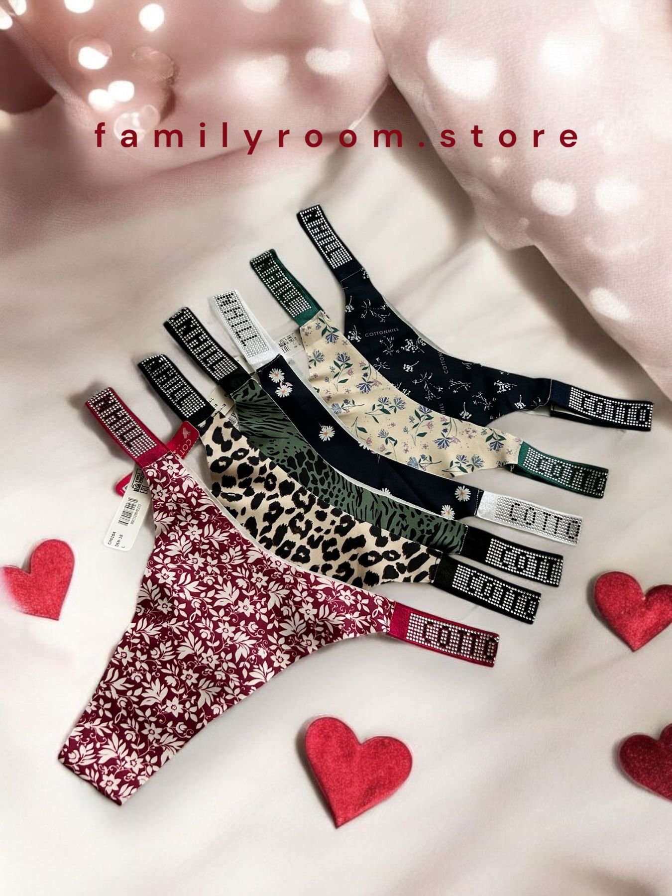 Ці трусики прикрашені витонченими стрічками зі стразами, що зачаровують своїм унікальним дизайном. На стрічках викладено напис “COTTONHILL” зі стійких до прання стразів, тому ви можете прати їх без остраху втратити блиск.