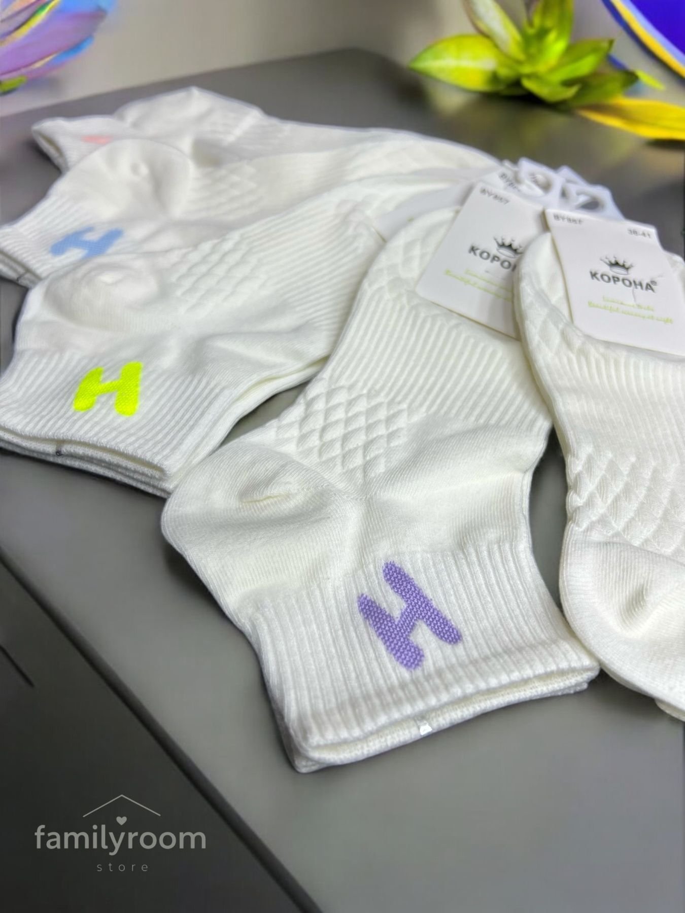 Молочні шкарпетки з кольоровими світлонакопичувальними літерами збоку. Укорочена гумка в рубчик забезпечує зручну посадку, а додаткова гумка-фіксатор посередині дарує надійну підтримку.