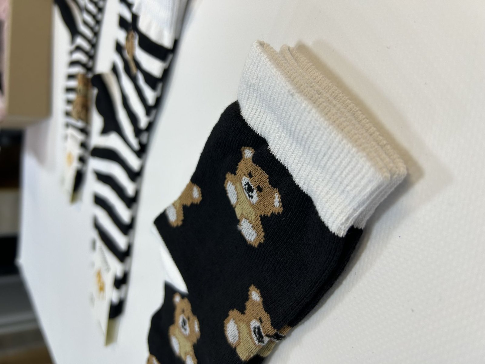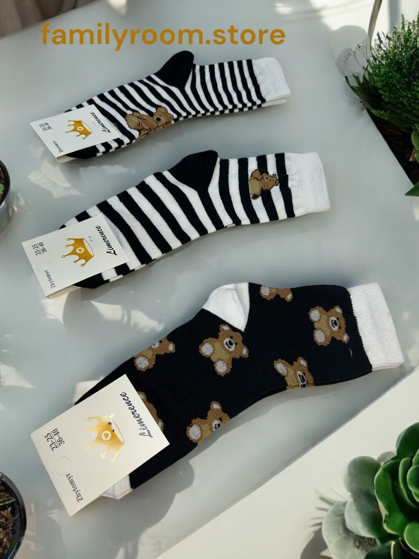 Стильні високі шкарпетки із принтом “ведмедики на чорно-білих смужках” — ідеальне доповнення до вашого образу! Вони не лише виглядають креативно, а й забезпечують комфорт на весь день завдяки якісному матеріалу. Підходять як для повсякденного носіння, так і для яскравих акцентів у вашому стилі.