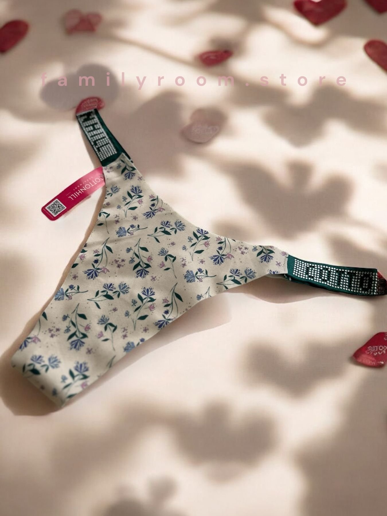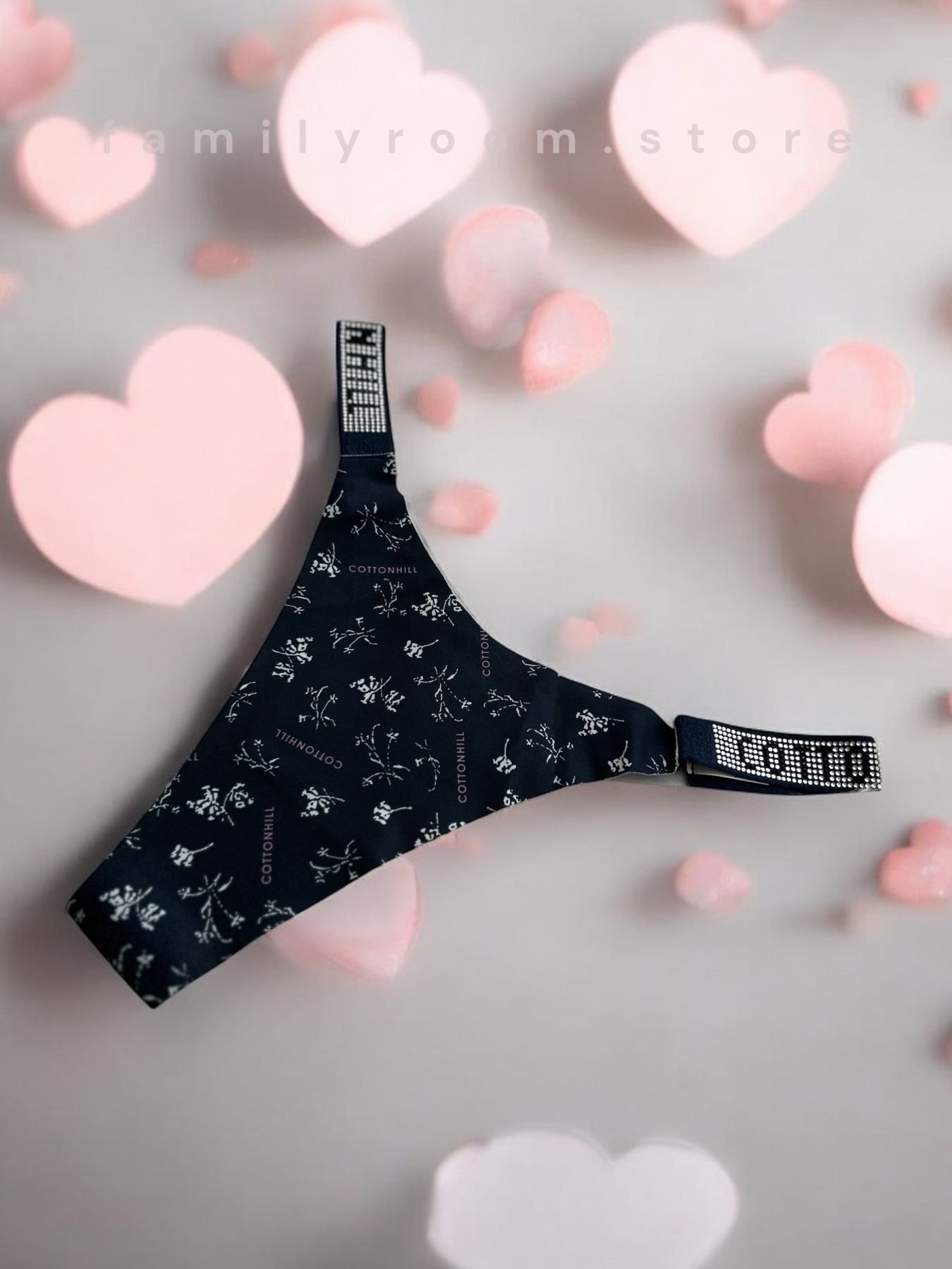Ці трусики прикрашені витонченими стрічками зі стразами, що зачаровують своїм унікальним дизайном. На стрічках викладено напис “COTTONHILL” зі стійких до прання стразів, тому ви можете прати їх без остраху втратити блиск.